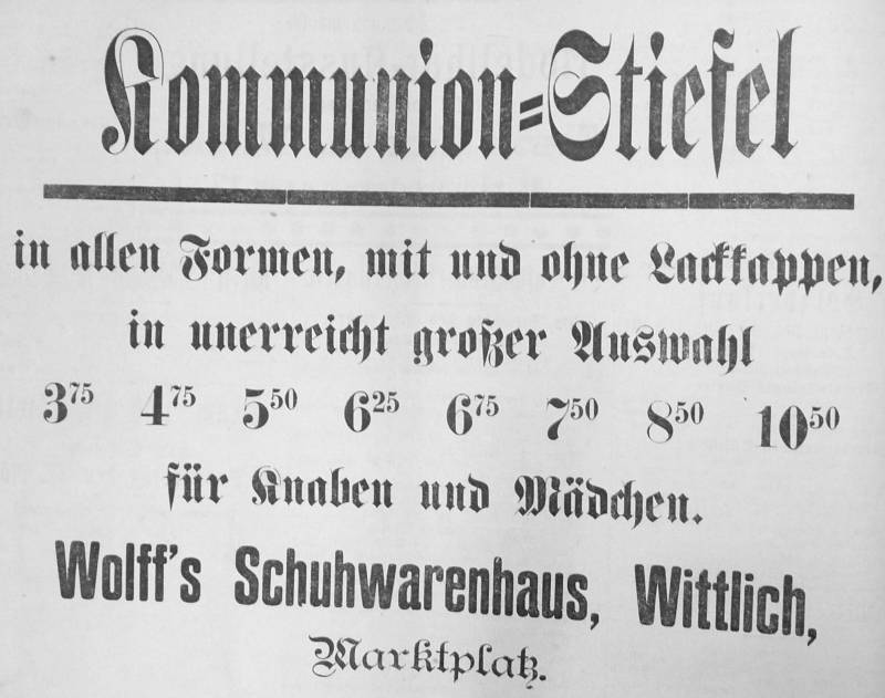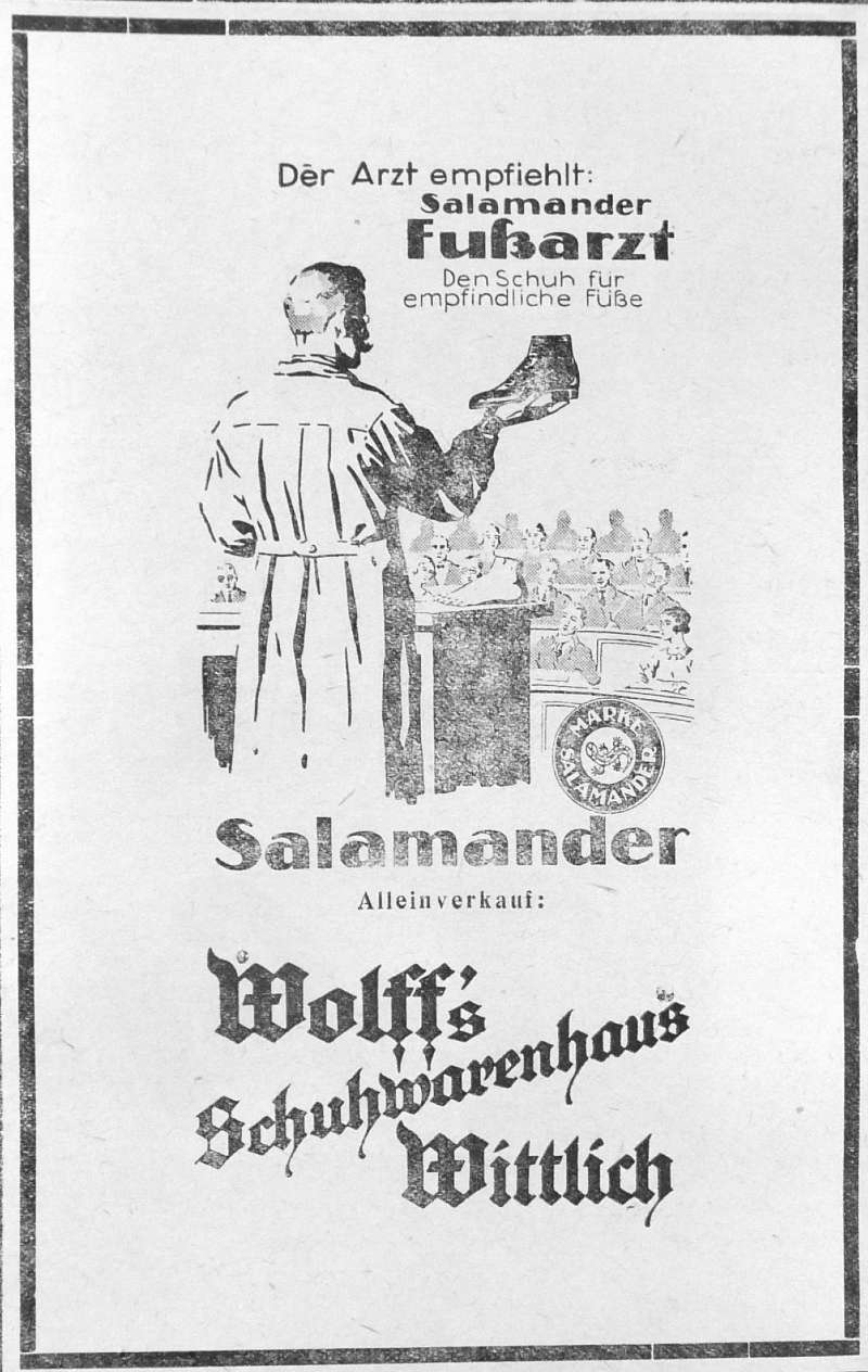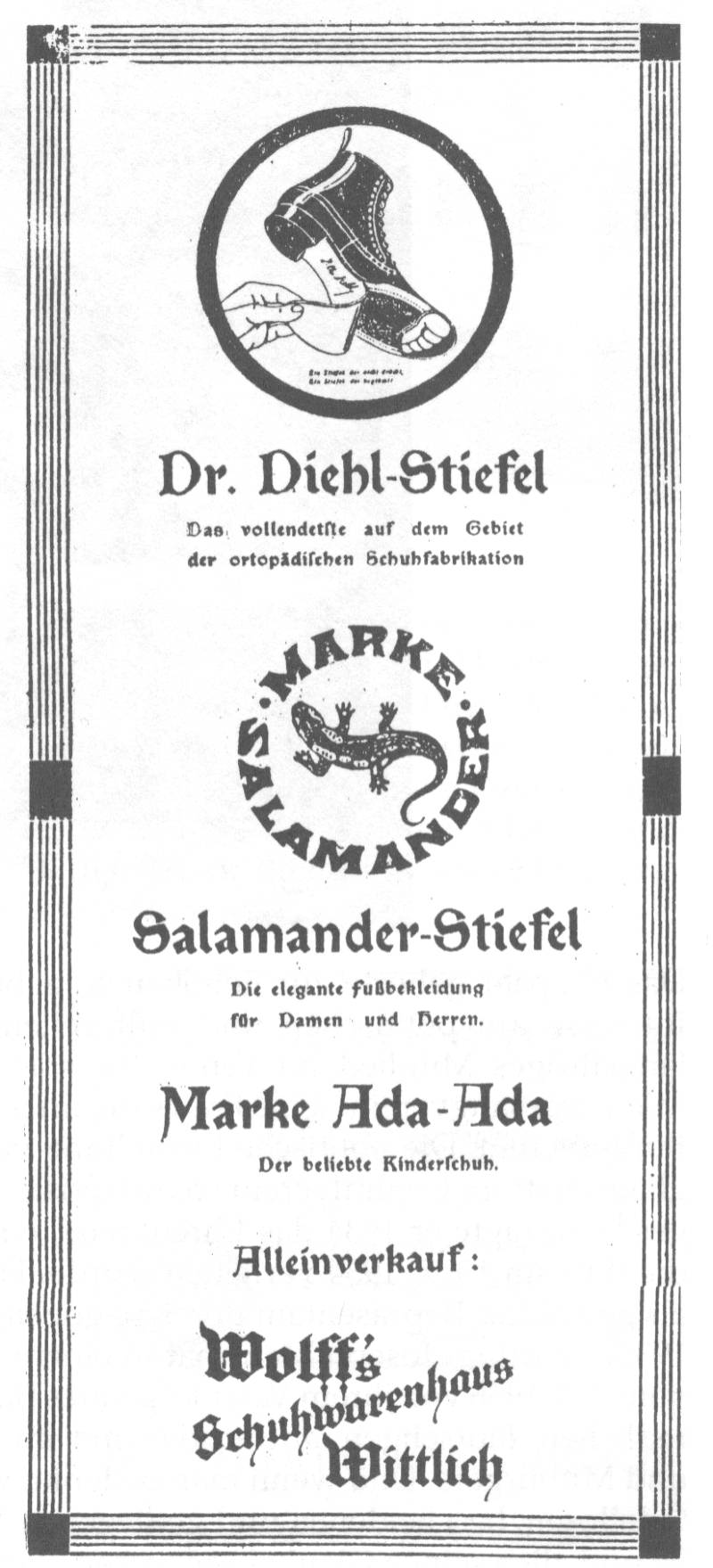 Sigmund Wolff, aus Lisdorf im Saarland, eröffnete am 13,05.1911 in angemieteten Räumen, am Marktplatz 4, "Wolffs Schuhwarenhaus". Er legte großen Wert auf Qualiät und Markenware. Die Firma J.Siegle & Co, Produzenten der "Salamanderschuhe", übertrugen dem Schuhwarenhaus Wolff den Alleinvertrieb für die Salamanderstiefel in der Stadt.