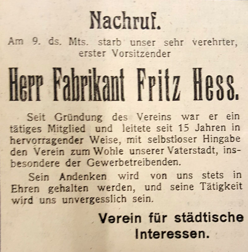 Fritz Hess starb 1925. Die Firma wurde aufgelöst.