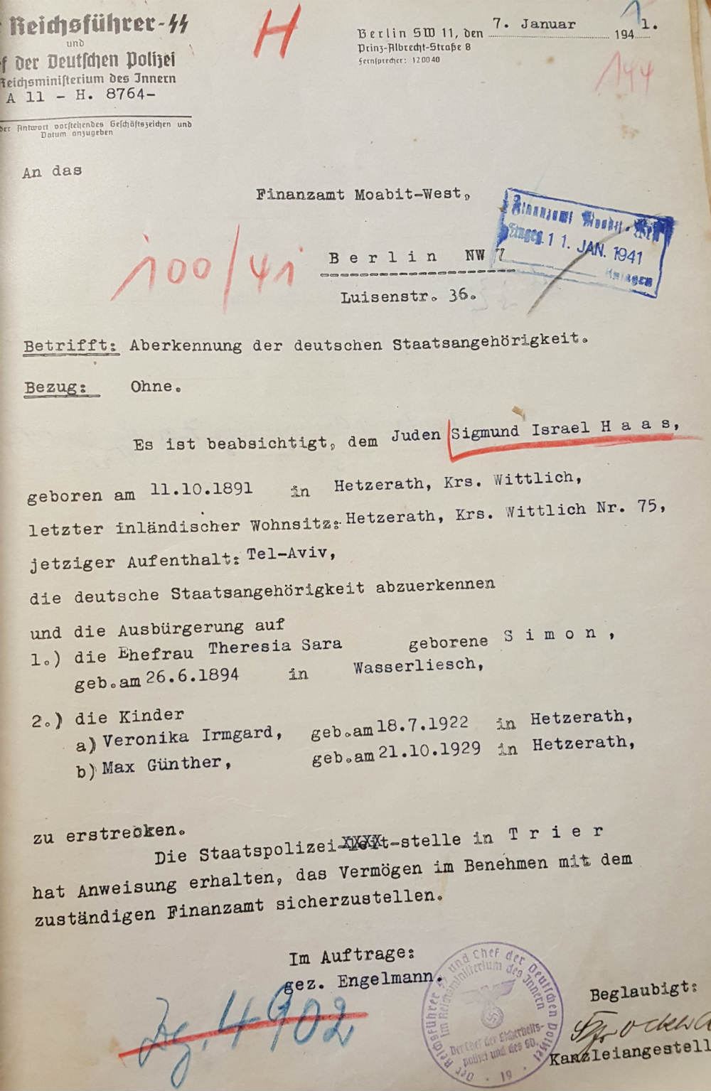 Sigmund Haas war, wie ihm frühere Bekannte nach Kriegsende bescheinigten, ein tüchtiger Händler, der die Viehmärkte in Trier, Wittlich und Kyllburg aufsuchte und in gesicherten Verhältnissen lebte. Ihm und seiner Familie wurde im Januar 1941, als man bereits in Palästina lebte, die deutsche Staatsbürgerschaft aberkannt und das Vermögen beschlagnahmt. Ob Sigmund Haas und seine Familie bereits vor 1938 belästigt oder angegriffen wurden, ist nicht bekannt. Was er auf seinen Handelsreisen aber mit Sicherheit im Jahr 1934 gesehen hat: NS-Fanatiker hatten an der Straße zwischen Wittlich und Trier Schilder angebracht, auf denen zu lesen war Achtung Todeskurve! Juden ist Fahren über 100 km/h gestattet. – Wer den Juden erschlägt, kommt in den Himmel. – Kauft nicht bei Juden! Als der Syndikus des Centralvereins deutscher Staatsbürger jüdischen Glaubens (C.V.), der später nach England emigrierte Hans Jacobi, sich über diese diskriminierenden Schilder beim Trierer Regierungsrat Dr. Saaßen beschwerte, antwortete dieser ganz legalistisch. Das erste Schild sei ein Verstoß gegen die Straßenverkehrsordnung, das zweite stehe wegen seines religiösen Charakters nicht im Einklang mit der nationalsozialistischen Weltanschauung – beide Schilder seien zu entfernen, während die Boykott-Schilder bleiben könnten, „da der Aufruf dem Willen des deutschen Volkes entspreche“.